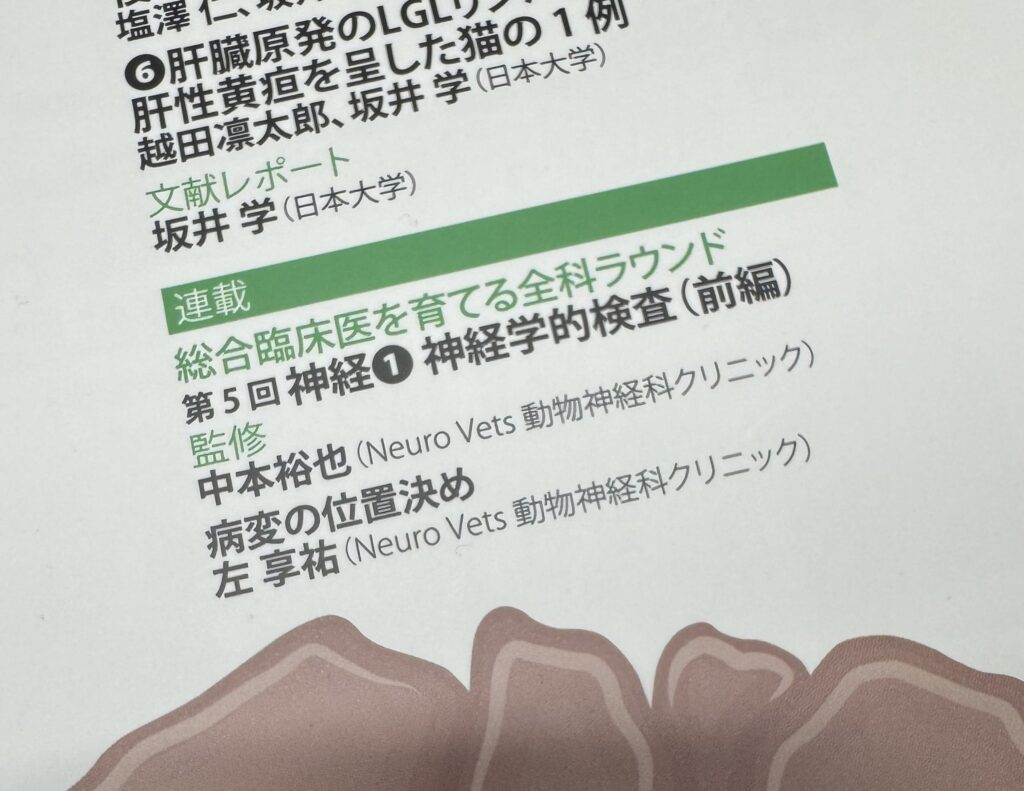 次号の12月号では、「神経学的検査(後編)」と題して、実際の症例を交えながら神経学的検査結果をどのように解釈していく必要があるのかに関して概説されています。こちらも執筆は勤務医の左が担当していますので、お楽しみにしてください。